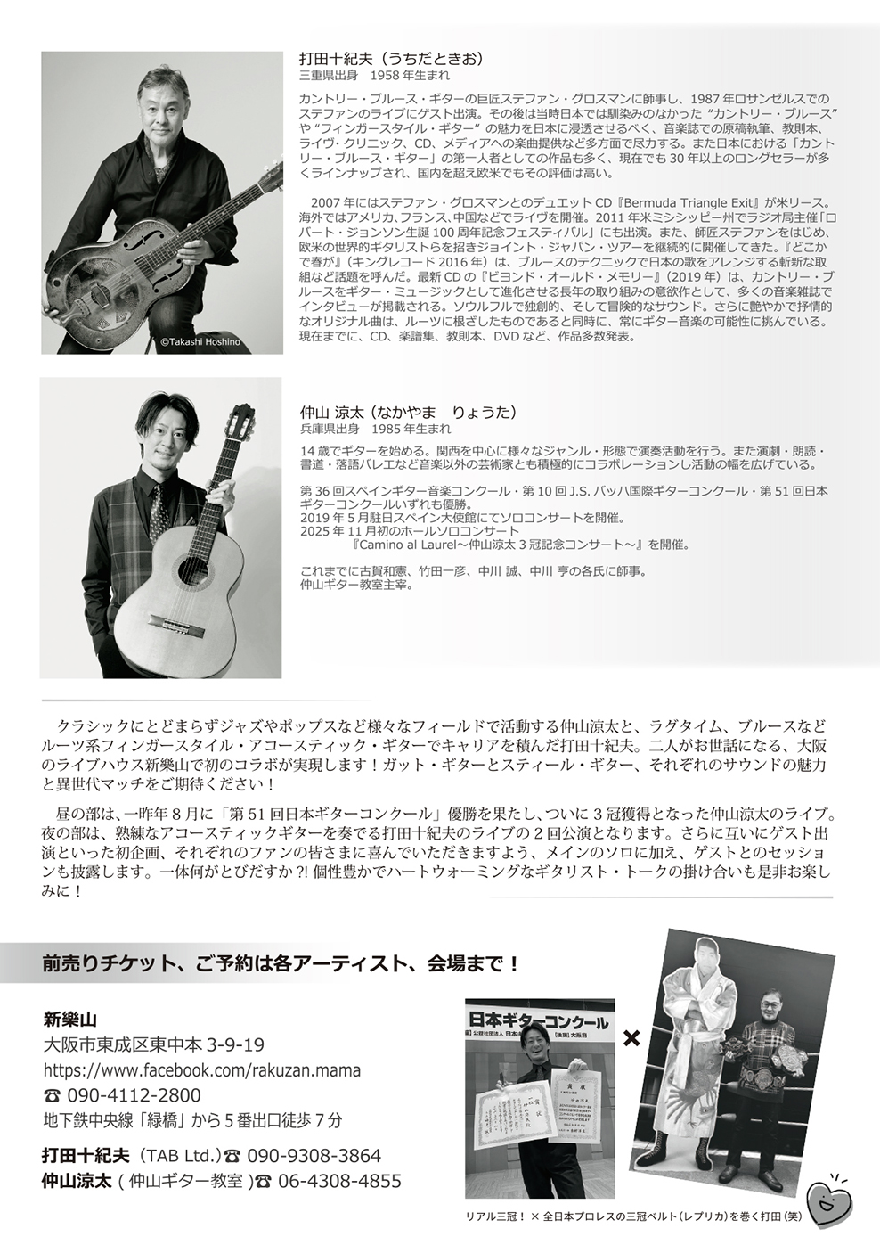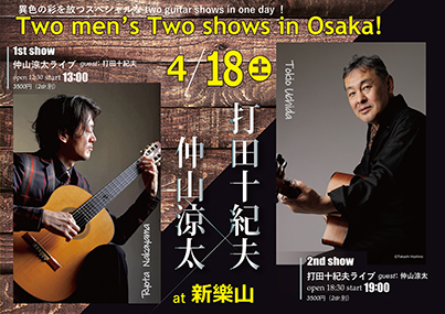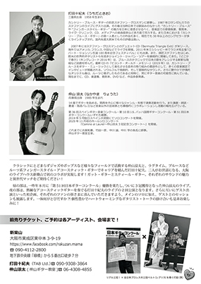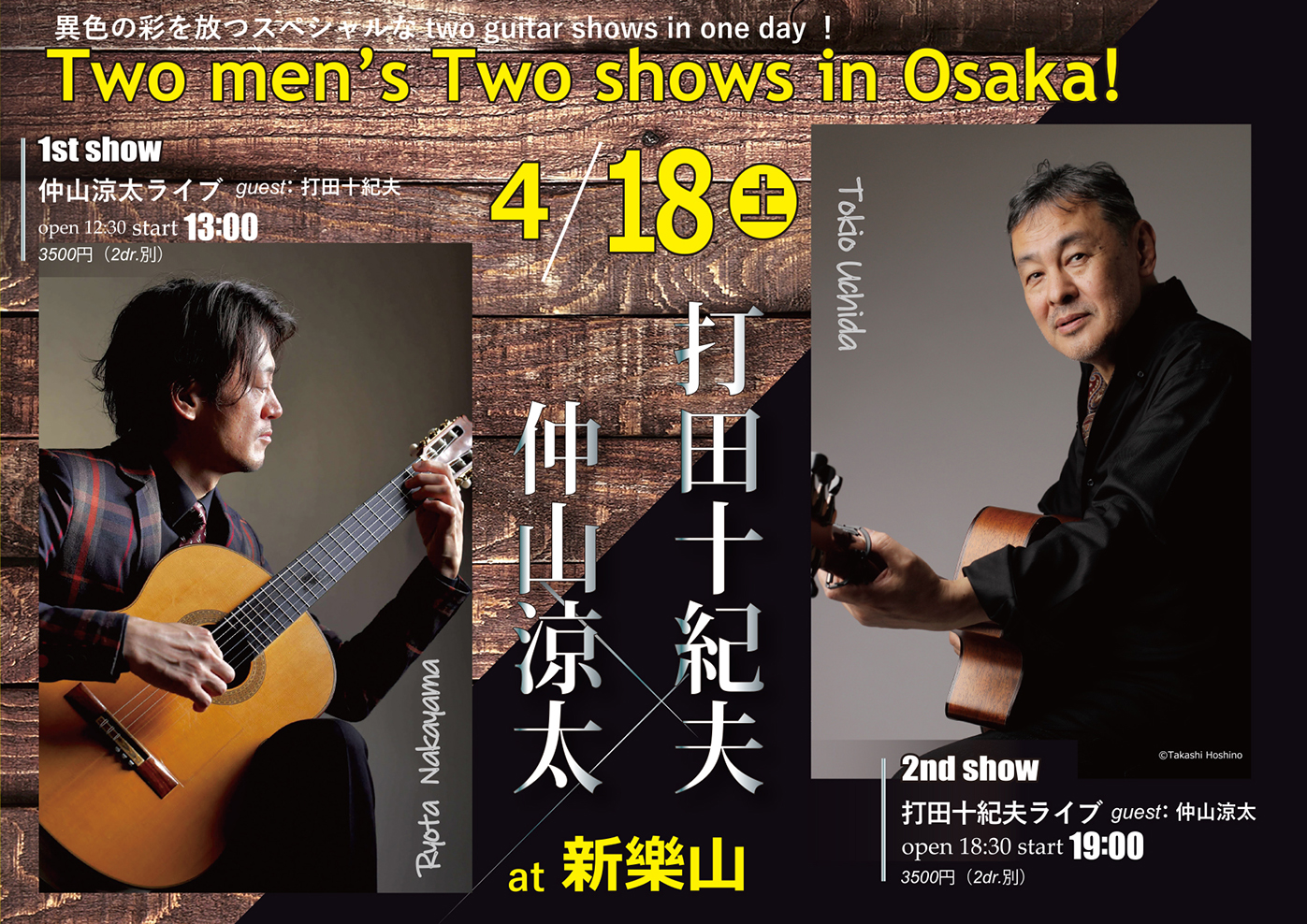 ★この日の「新樂山」は【Two men's Two shows in Osaka】と称し、昼の部「仲山涼太ライヴ」、夜の部「打田十紀夫ライヴ」の2部構成で開催、それぞれのライヴにゲスト出演するという企画になっています。夜の部「打田十紀夫ライヴ」にゲスト出演する仲山涼太は、権威ある3つのクラシックギター・コンテストで優勝した若き世代、二人の共演をご期待ください。TABネットショップでの前売り販売 (↓) は、夜の部「打田十紀夫ライヴ」になります。 ◆前売りチケットをTABネットショップで購入できます。残席少々です!! |
