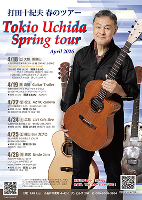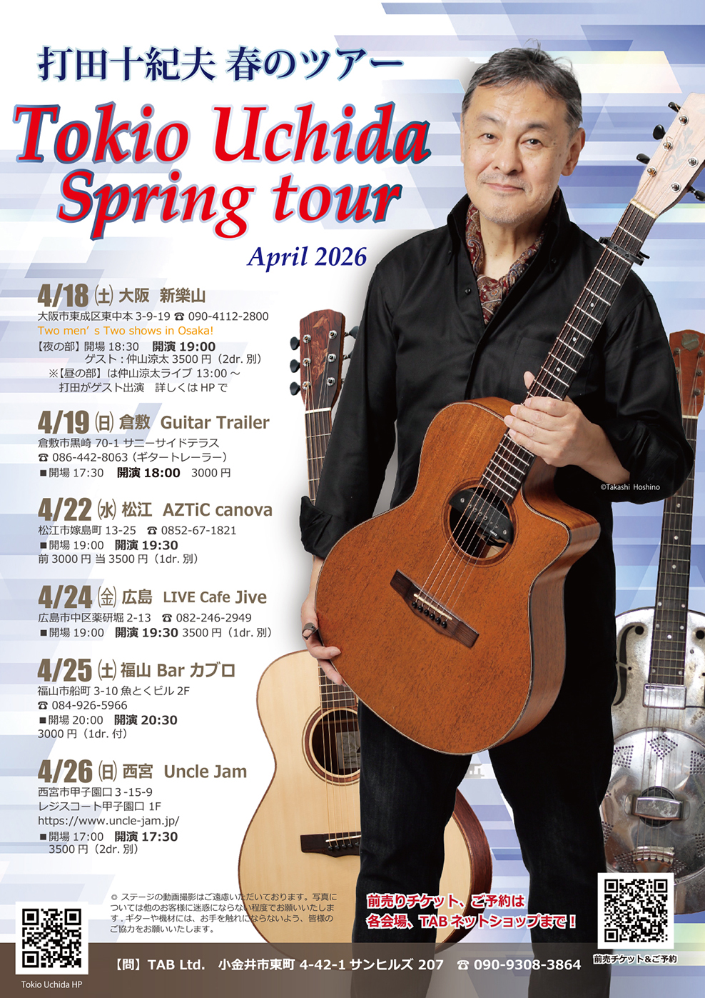 | 4/22 (水) 打田十紀夫 アコースティック・ギター・ライヴ 場所:松江 AZTic canova TEL:0852-67-1821 ★関西〜中国地方を回る恒例の春のツアー、松江はいつもお世話になっている「AZTic canova」で今年もライヴ開催です。2026年は“Still Forward”をテーマにさらに一歩踏み出す覚悟です。カントリーブルース、ラグタイム、ケルティック、変態系など、多彩なフィンガースタイル・ギターと、年輪を重ねた面白癒しトーク…気合十分の“アコースティック・エンターテイメント”を楽しんでいただきたいと思います。ご予約は上記会場、またはTABネットショップからもお申し込みいただけます。 |